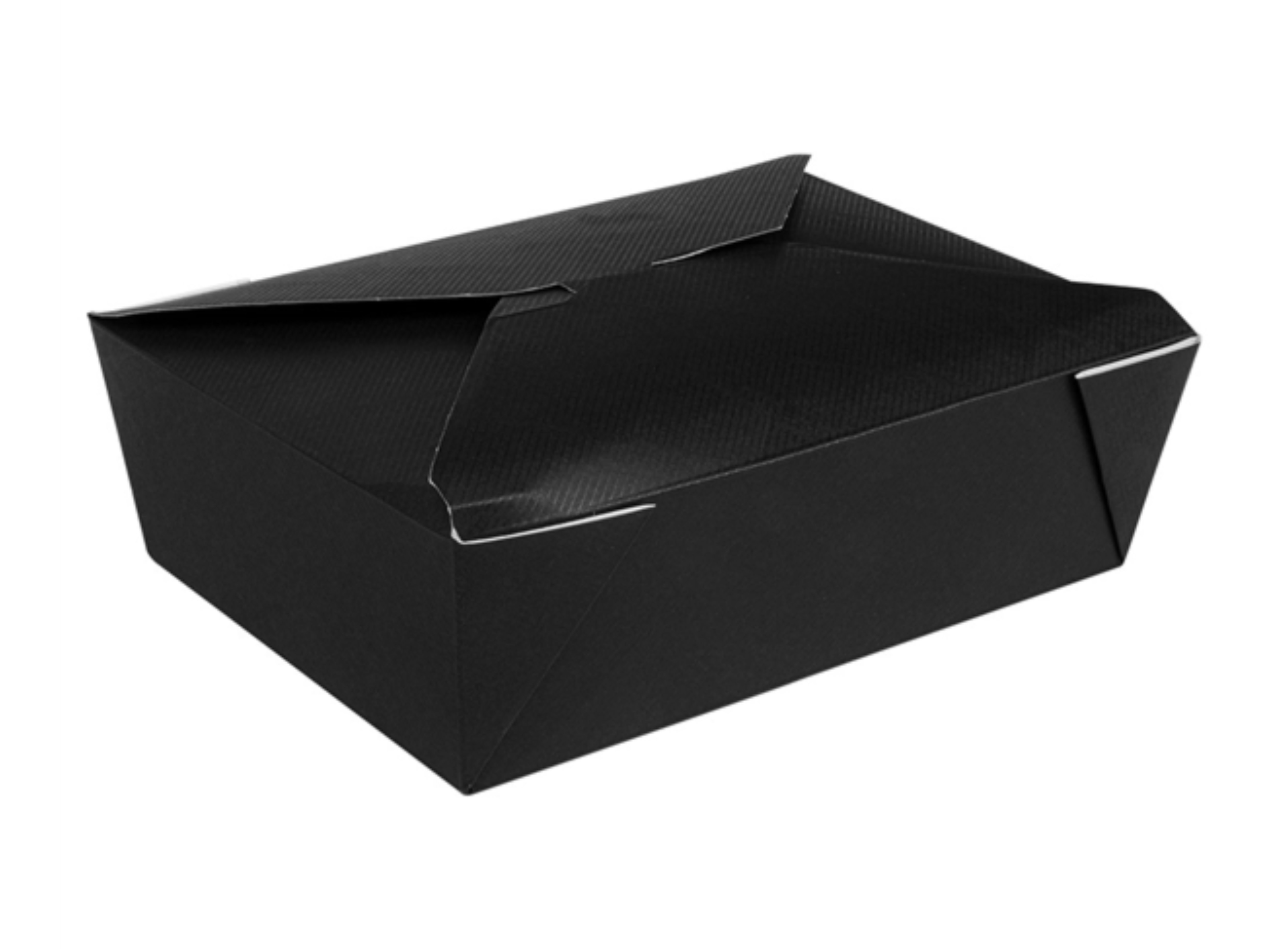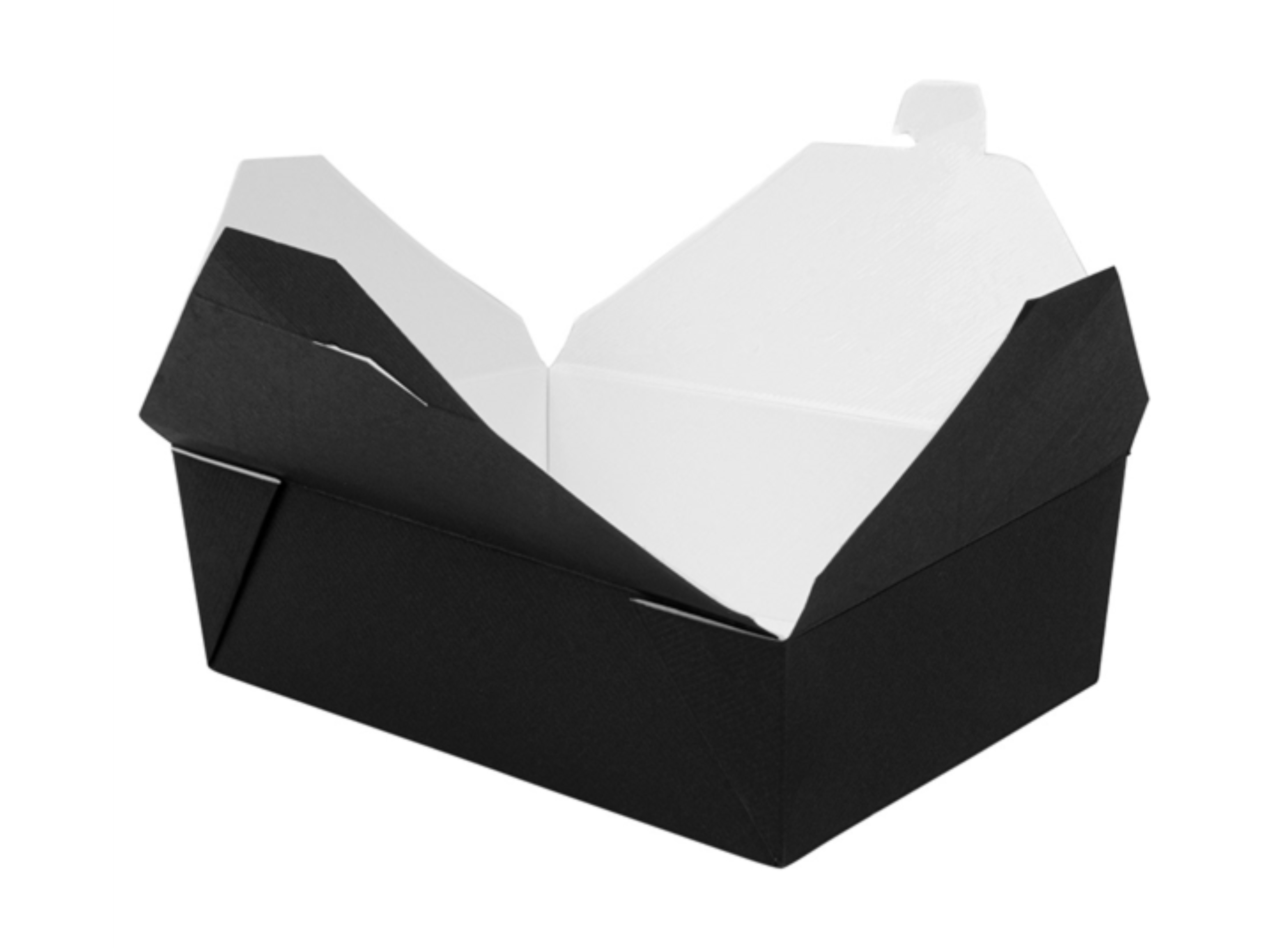 Schicker schwarzer Lebensmittelbehälter, der für verschiedene Gerichte zum Mitnehmen geeignet ist.