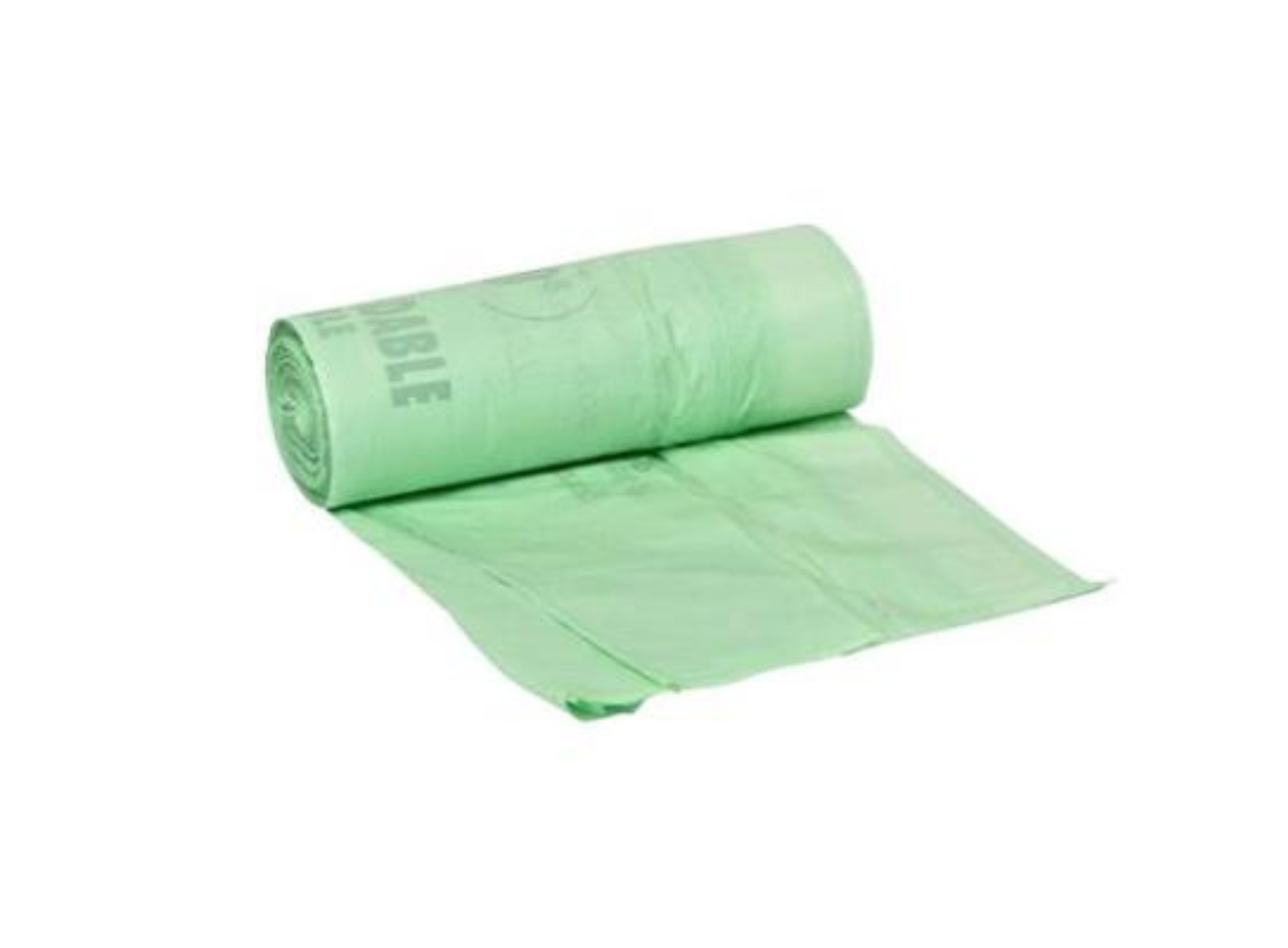 Sac compostable, fabriqué à partir de fécule de pomme de terre, avec fermeture à cordon pour le tri des déchets organiques.